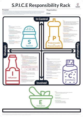 S.P.I.C.E is the simplest, most effective means for defining and documenting project roles and responsibilities. S.P.I.C.E. describes the various roles and participants to execute projects successfully. S.P.I.C.E. is an acronym derived from the 5 key responsibilities: Sponsor, Project leader, Influencers, Contributors and Executors.